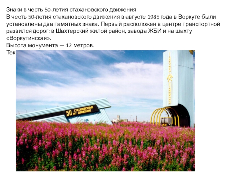 августе 1985 года в Воркуте были установлены два памятных знака. Первый расположен в центре транспортной развился дорог: в Шахтерский жилой район, завода ЖБИ и на шахту «Воркутинская».
