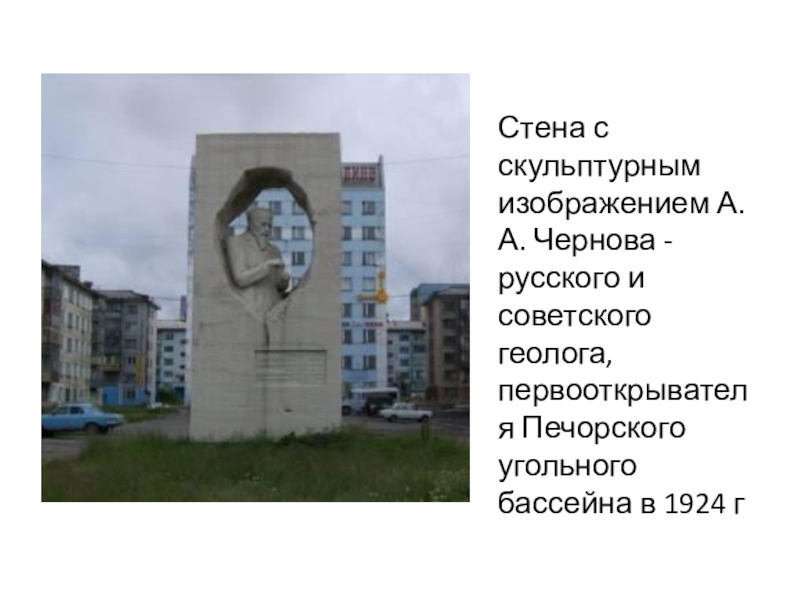 Слайд 3Стена с скульптурным изображением А.А. Чернова - русского и советского геолога,