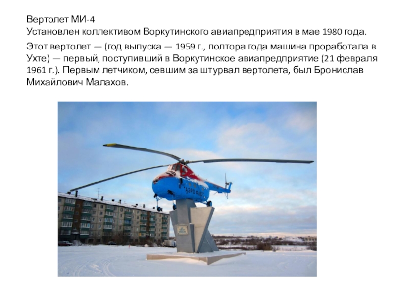 (год выпуска — 1959 г., полтора года машина проработала в Ухте) — первый, поступивший в Воркутинское авиапредприятие (21 февраля 1961 г.). Первым летчиком, севшим за штурвал вертолета, был Бронислав Михайлович Малахов.