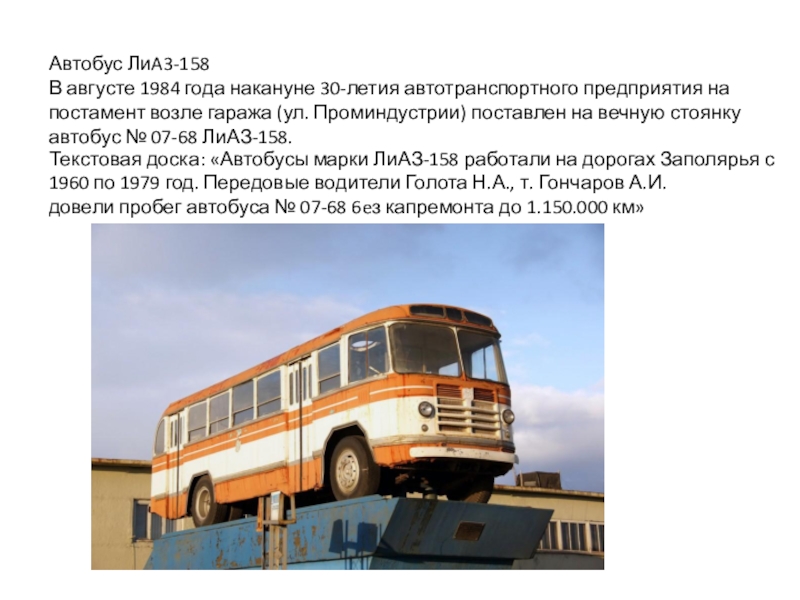 Текстовая доска: «Автобусы марки ЛиАЗ-158 работали на дорогах Заполярья с 1960 по 1979 год. Передовые водители Голота Н.А., т. Гончаров А.И. довели пробег автобуса № 07-68 6eз капремонта до 1.150.000 км»