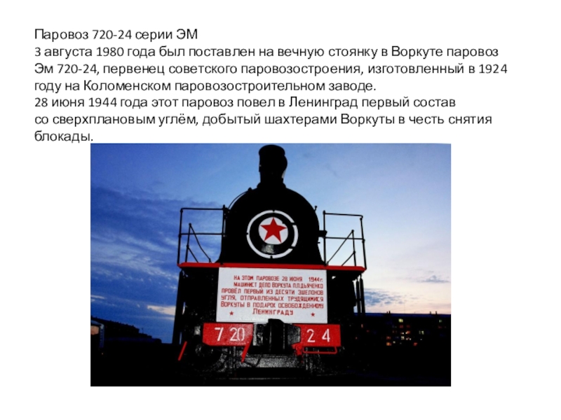 Воркуте паровоз Эм 720-24, первенец советского паровозостроения, изготовленный в 1924 году на Коломенском паровозостроительном заводе.