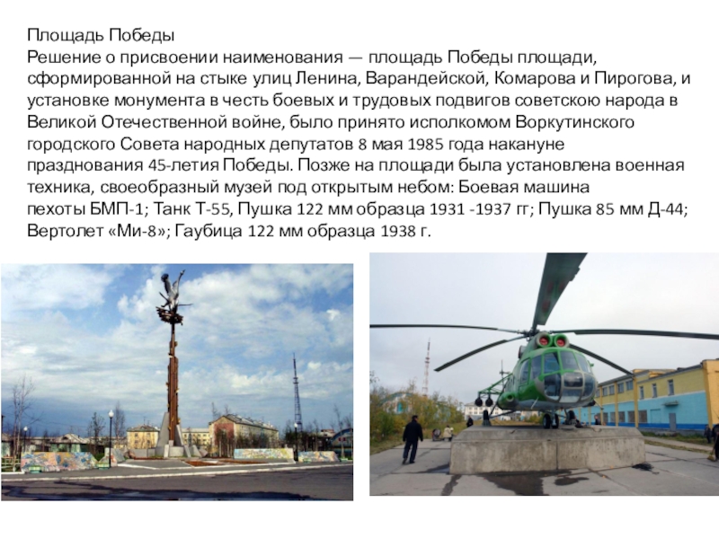 Ленина, Варандейской, Комарова и Пирогова, и установке монумента в честь боевых и трудовых подвигов советскою народа в Великой Отечественной войне, было принято исполкомом Воркутинского городского Совета народных депутатов 8 мая 1985 года накануне празднования 45-летия Победы. Позже на площади была установлена военная техника, своеобразный музей под открытым небом: Боевая машина пехоты БМП-1; Танк Т-55, Пушка 122 мм образца 1931 -1937 гг; Пушка 85 мм Д-44; Вертолет «Ми-8»; Гаубица 122 мм образца 1938 г.