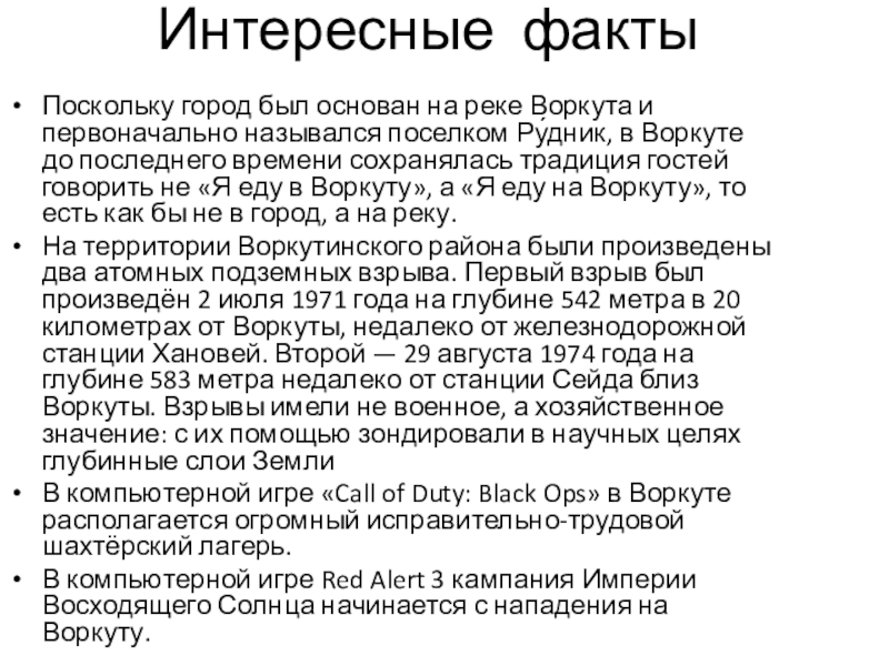 В компьютерной игре «Call of Duty: Black Ops» в Воркуте располагается огромный исправительно-трудовой шахтёрский лагерь.