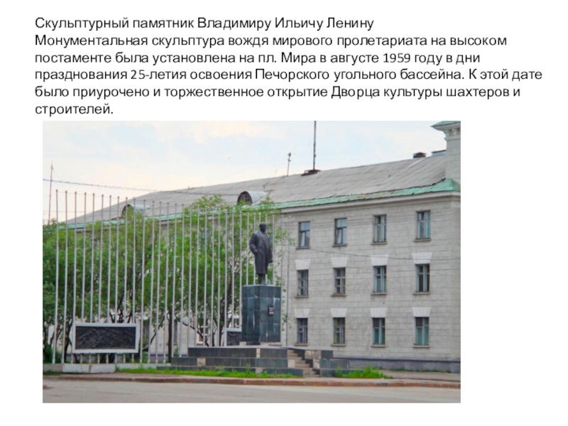 постаменте была установлена на пл. Мира в августе 1959 году в дни празднования 25-летия освоения Печорского угольного бассейна. К этой дате было приурочено и торжественное открытие Дворца культуры шахтеров и строителей.