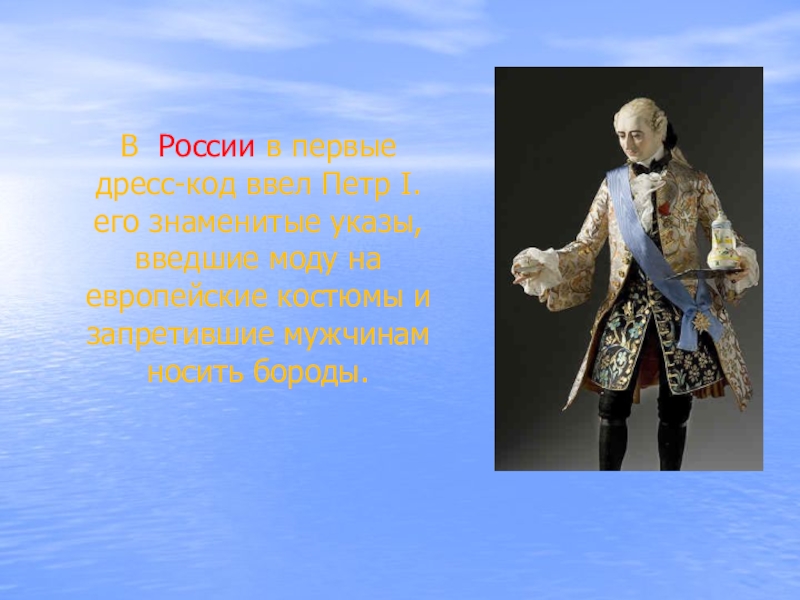 Слайд 4В России в первые дресс-код ввел Петр I. его знаменитые указы,