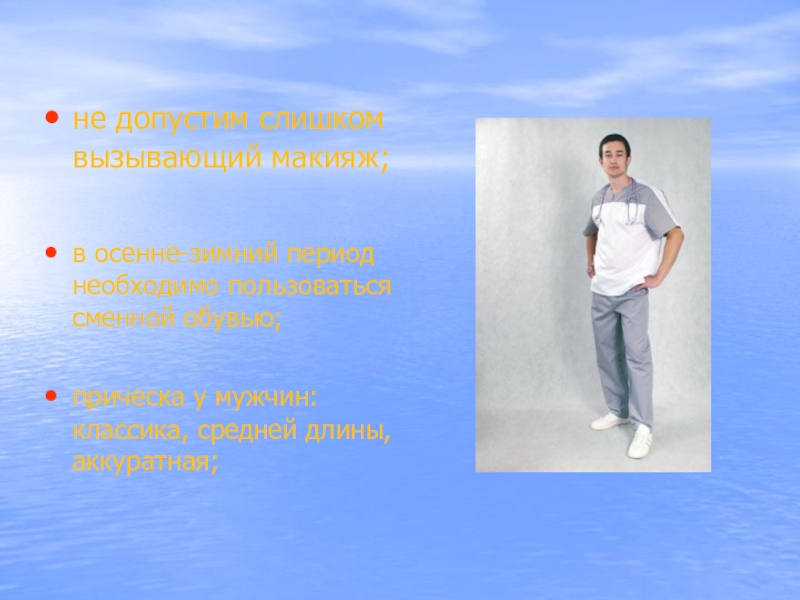 не допустим слишком вызывающий макияж;в осенне-зимний период необходимо пользоваться сменной обувью;прическа у мужчин: классика, средней длины, аккуратная;
