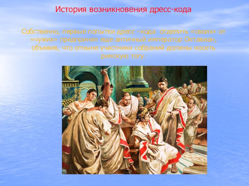История возникновения дресс-кодаСобственно, первые попытки дресс –кода отделить «своих» от «чужих» предпринял еще античный император Октавиан,  объявив,