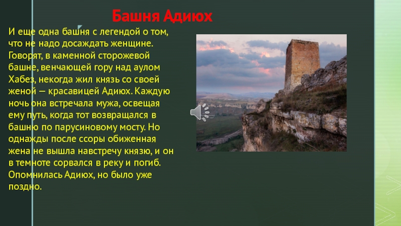 надо досаждать женщине. Говорят, в каменной сторожевой башне, венчающей гору над аулом Хабез, некогда жил князь со своей женой — красавицей Адиюх. Каждую ночь она встречала мужа, освещая ему путь, когда тот возвращался в башню по парусиновому мосту. Но однажды после ссоры обиженная жена не вышла навстречу князю, и он в темноте сорвался в реку и погиб. Опомнилась Адиюх, но было уже поздно.