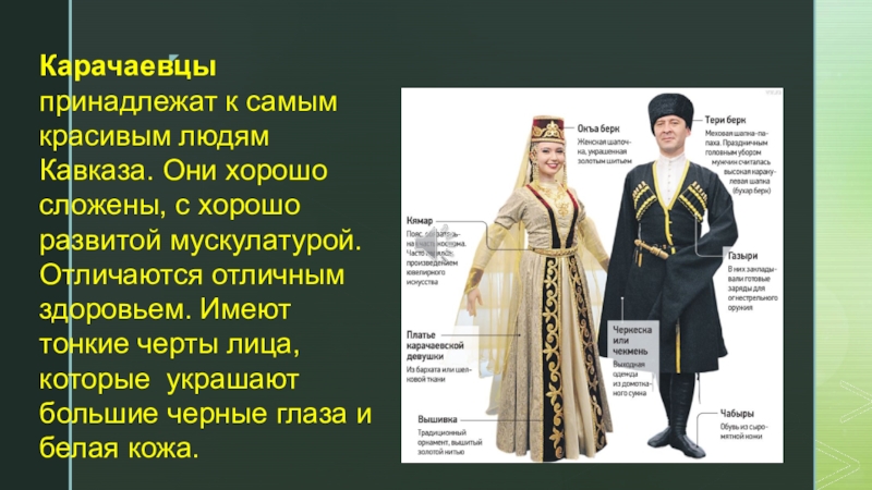 Слайд 5Карачаевцы принадлежат к самым красивым людям Кавказа. Они хорошо сложены, с