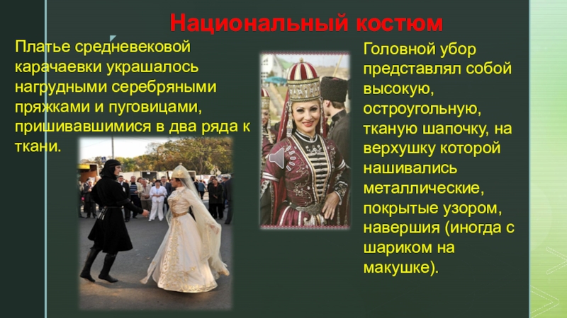 Платье средневековой карачаевки украшалось нагрудными серебряными пряжками и пуговицами, пришивавшимися