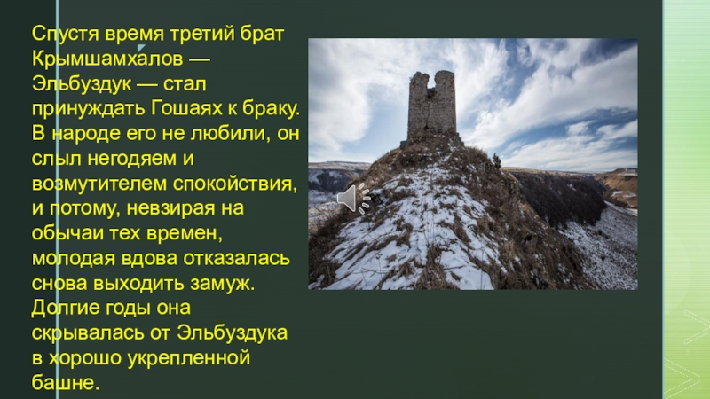 Слайд 31Спустя время третий брат Крымшамхалов — Эльбуздук — стал принуждать Гошаях к браку.