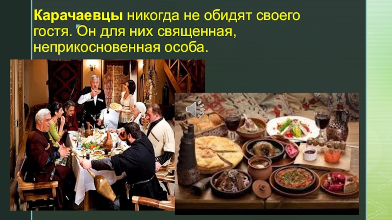 Слайд 8Карачаевцы никогда не обидят своего гостя. Он для них священная, неприкосновенная