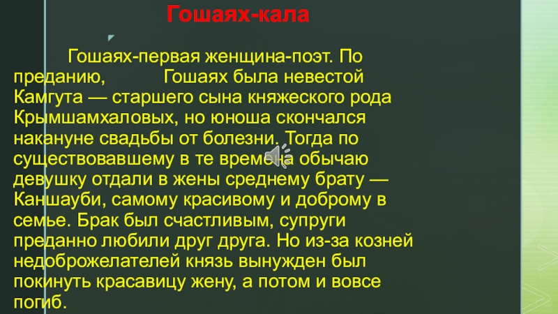 Гошаях-первая женщина-поэт. По преданию, Гошаях была невестой Камгута — старшего сына княжеского рода Крымшамхаловых, но юноша скончался накануне свадьбы от болезни. Тогда по существовавшему в те времена обычаю девушку отдали в жены среднему брату — Каншауби, самому красивому и доброму в семье. Брак был счастливым, супруги преданно любили друг друга. Но из-за козней недоброжелателей князь вынужден был покинуть красавицу жену, а потом и вовсе погиб.