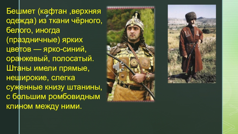Слайд 21Бешмет (кафтан ,верхняя одежда) из ткани чёрного, белого, иногда (праздничные) ярких