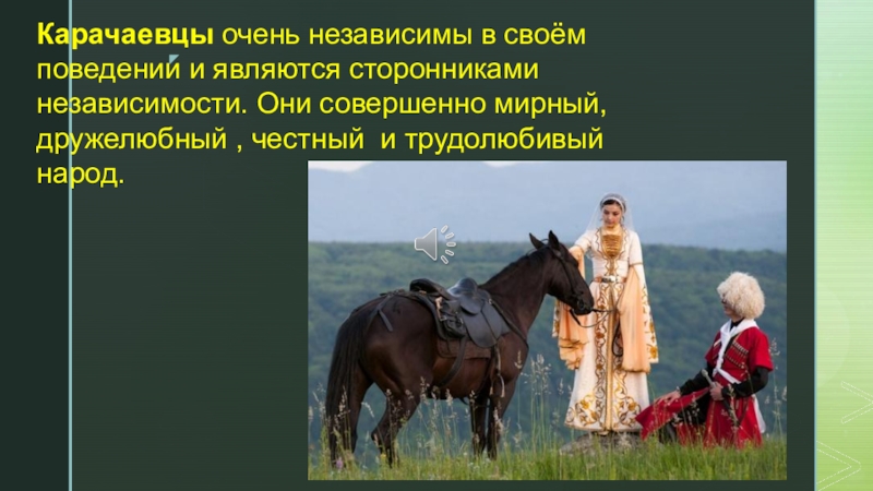 Слайд 7Карачаевцы очень независимы в своём поведении и являются сторонниками независимости. Они