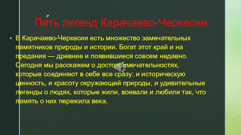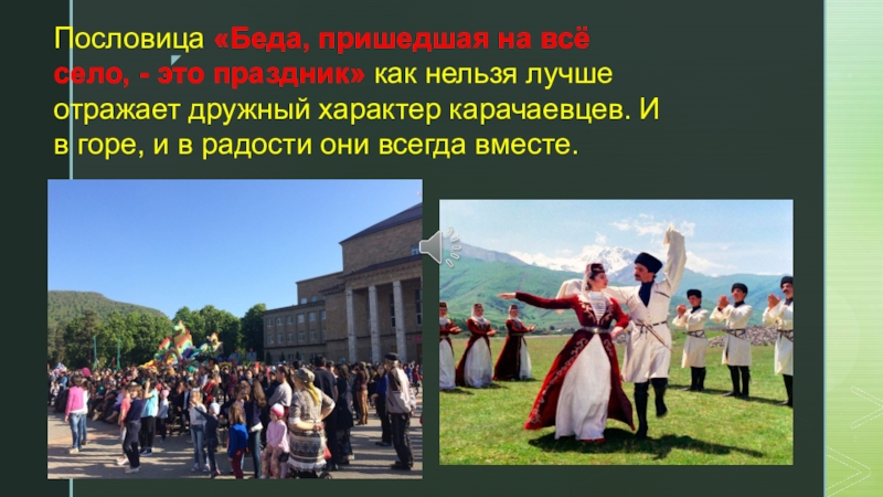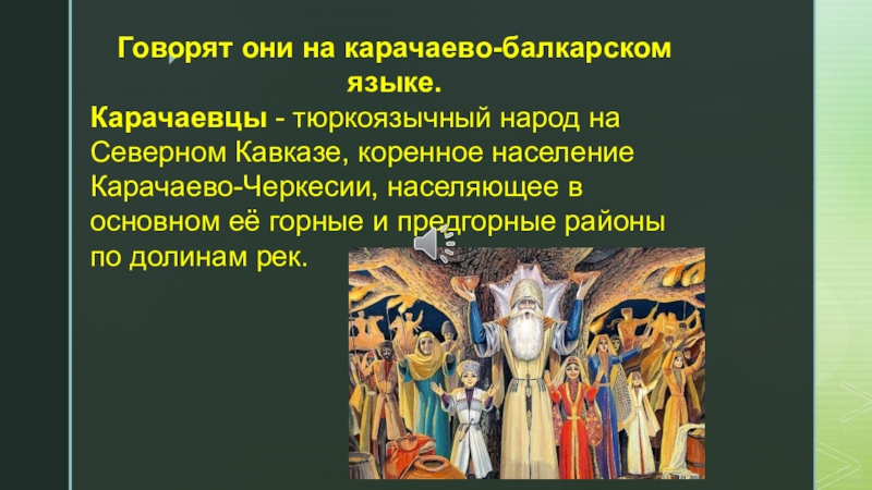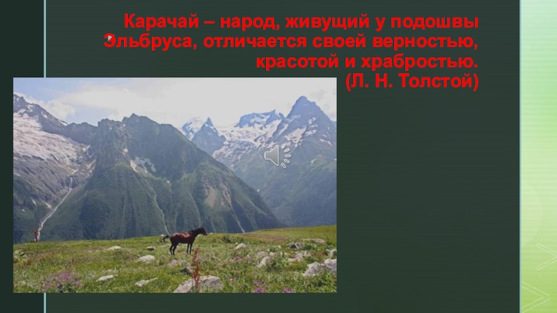 Слайд 35Карачай – народ, живущий у подошвы Эльбруса, отличается своей верностью, красотой