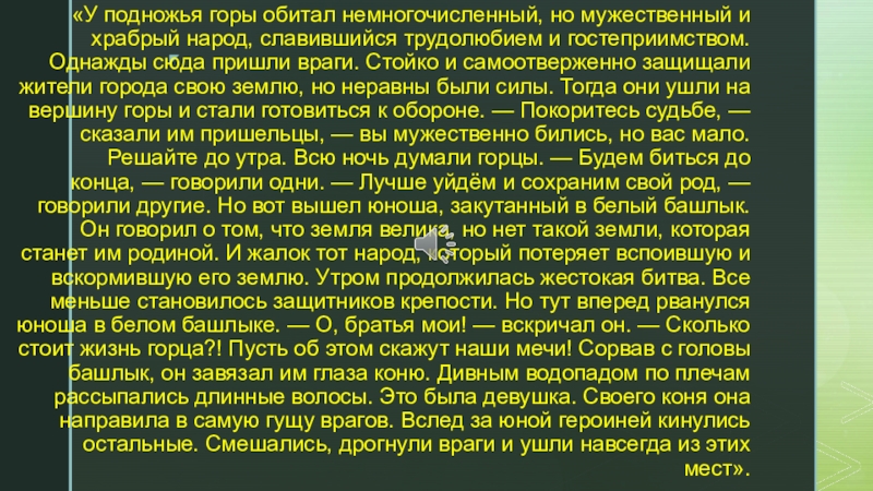 трудолюбием и гостеприимством. Однажды сюда пришли враги. Стойко и самоотверженно защищали жители города свою землю, но неравны были силы. Тогда они ушли на вершину горы и стали готовиться к обороне. — Покоритесь судьбе, — сказали им пришельцы, — вы мужественно бились, но вас мало. Решайте до утра. Всю ночь думали горцы. — Будем биться до конца, — говорили одни. — Лучше уйдём и сохраним свой род, — говорили другие. Но вот вышел юноша, закутанный в белый башлык. Он говорил о том, что земля велика, но нет такой земли, которая станет им родиной. И жалок тот народ, который потеряет вспоившую и вскормившую его землю. Утром продолжилась жестокая битва. Все меньше становилось защитников крепости. Но тут вперед рванулся юноша в белом башлыке. — О, братья мои! — вскричал он. — Сколько стоит жизнь горца?! Пусть об этом скажут наши мечи! Cорвав с головы башлык, он завязал им глаза коню. Дивным водопадом по плечам рассыпались длинные волосы. Это была девушка. Своего коня она направила в самую гущу врагов. Вслед за юной героиней кинулись остальные. Смешались, дрогнули враги и ушли навсегда из этих мест».