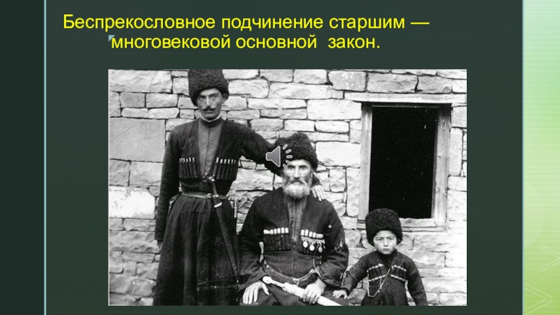 Слайд 9Беспрекословное подчинение старшим — многовековой основной закон.
