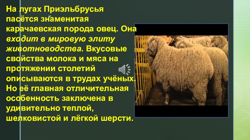 Слайд 15На лугах Приэльбрусья пасётся знаменитая карачаевская порода овец. Она входит в