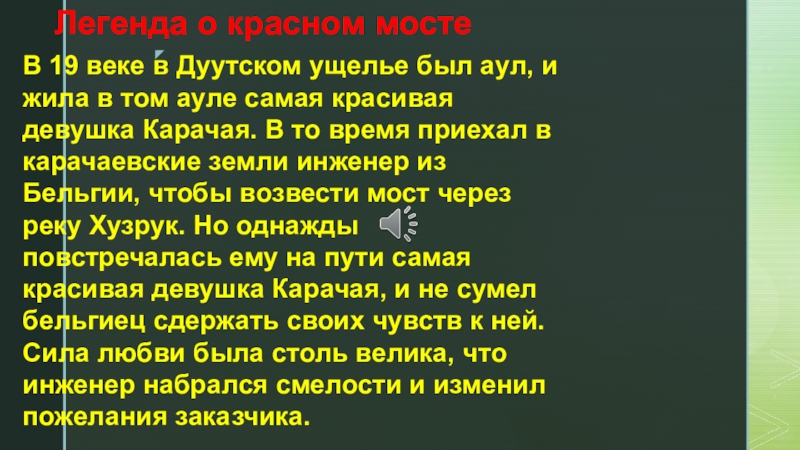 и жила в том ауле самая красивая девушка Карачая. В то время приехал в карачаевские земли инженер из Бельгии, чтобы возвести мост через реку Хузрук. Но однажды повстречалась ему на пути самая красивая девушка Карачая, и не сумел бельгиец сдержать своих чувств к ней. Сила любви была столь велика, что инженер набрался смелости и изменил пожелания заказчика.