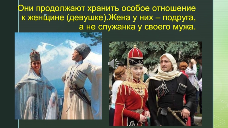 Слайд 10Они продолжают хранить особое отношение к женщине (девушке).Жена у них –