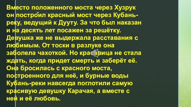 Слайд 28Вместо положенного моста через Хузрук он построил красный мост через Кубань-реку,