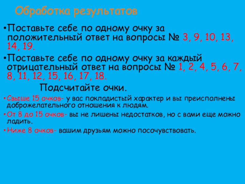Свыше 15 очков- у вас покладистый характер и вы преисполнены доброжелательного отношения к людям.