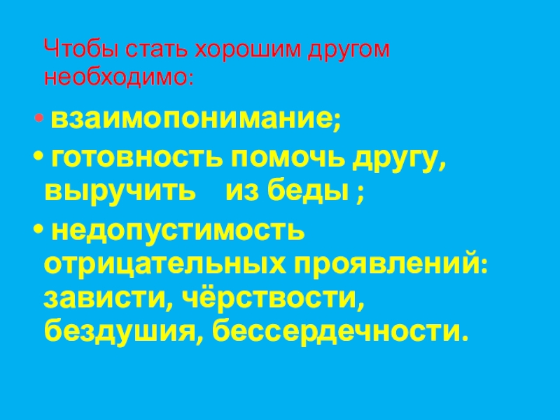 недопустимость отрицательных проявлений: зависти, чёрствости, бездушия, бессердечности.