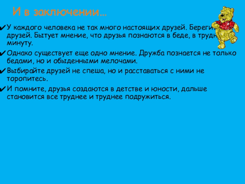 друзей. Бытует мнение, что друзья познаются в беде, в трудную минуту.