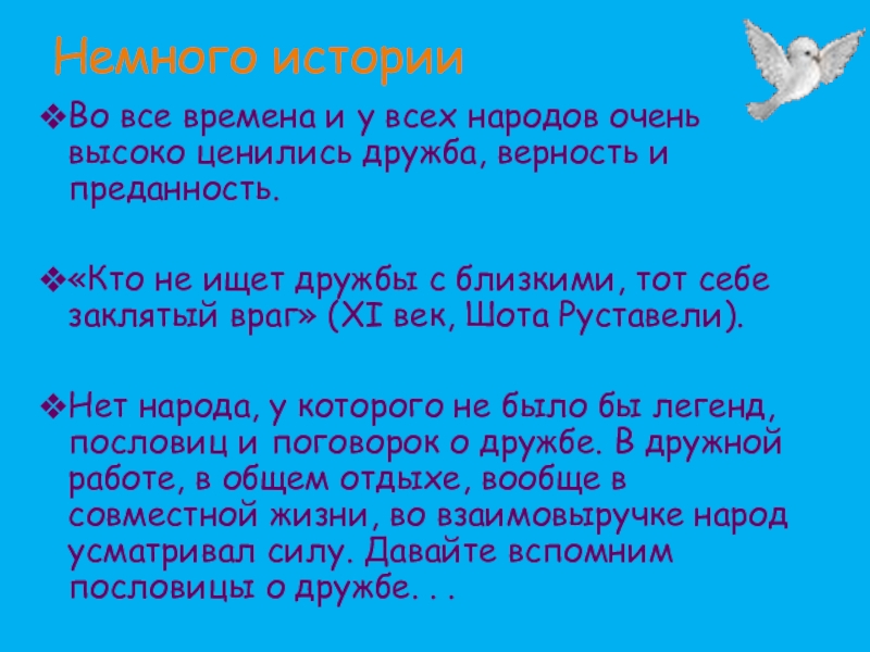 Нет народа, у которого не было бы легенд, пословиц и поговорок о дружбе. В дружной работе, в общем отдыхе, вообще в совместной жизни, во взаимовыручке народ усматривал силу. Давайте вспомним пословицы о дружбе. . .