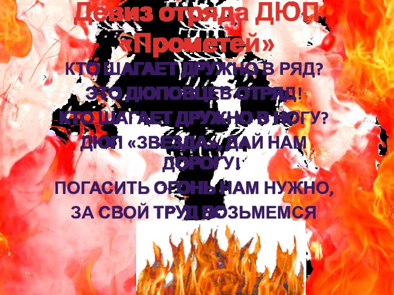 Девиз отряда ДЮП «Прометей»Кто шагает дружно в ряд?Это ДЮПовцев отряд!Кто шагает дружно в ногу?ДЮП «Звезда», дай нам
