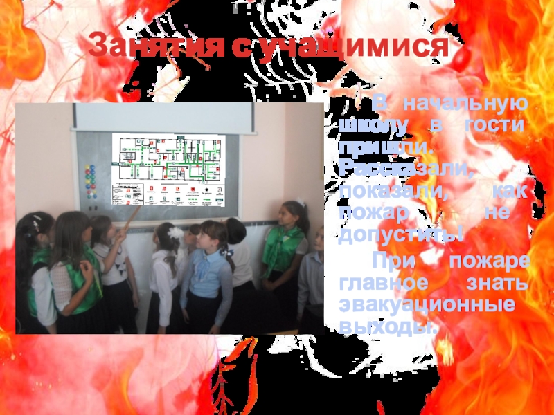 Занятия с учащимисяВ начальную школу в гости пришли. Рассказали, показали, как пожар не допустить!При пожаре главное знать