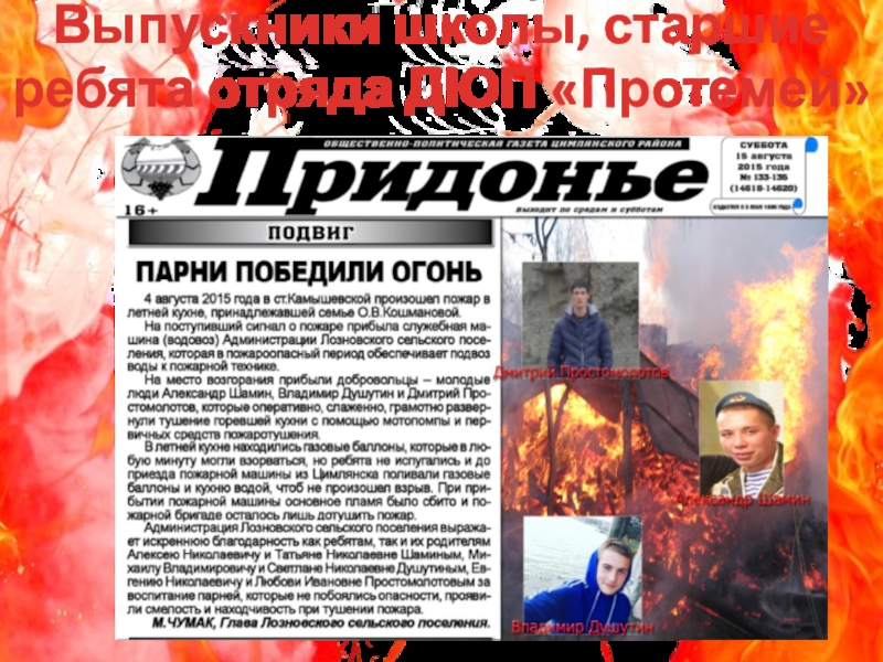Слайд 16Выпускники школы, старшие ребята отряда ДЮП «Протемей»