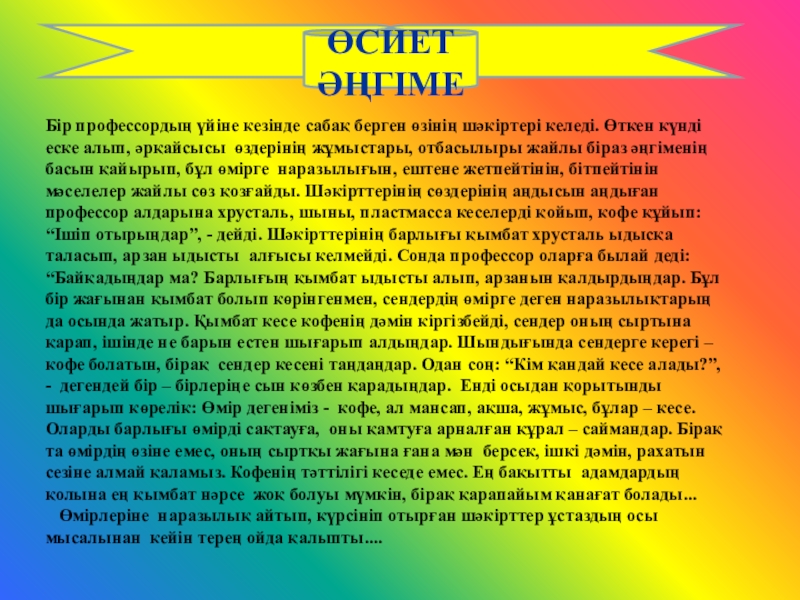 еске алып, әрқайсысы өздерінің жұмыстары, отбасылыры жайлы біраз әңгіменің басын қайырып, бұл өмірге наразылығын, ештене жетпейтінін, бітпейтінін мәселелер жайлы сөз қозғайды. Шәкірттерінің сөздерінің аңдысын аңдыған профессор алдарына хрусталь, шыны, пластмасса кеселерді қойып, кофе құйып: “Ішіп отырыңдар”, - дейді. Шәкірттерінің барлығы қымбат хрусталь ыдысқа таласып, арзан ыдысты алғысы келмейді. Сонда профессор оларға былай деді: “Байқадыңдар ма? Барлығың қымбат ыдысты алып, арзанын қалдырдыңдар. Бұл бір жағынан қымбат болып көрінгенмен, сендердің өмірге деген наразылықтарың да осында жатыр. Қымбат кесе кофенің дәмін кіргізбейді, сендер оның сыртына қарап, ішінде не барын естен шығарып алдыңдар. Шындығында сендерге керегі – кофе болатын, бірақ сендер кесені таңдаңдар. Одан соң: “Кім қандай кесе алады?”, - дегендей бір – бірлеріңе сын көзбен қарадыңдар. Енді осыдан қорытынды шығарып көрелік: Өмір дегеніміз - кофе, ал мансап, ақша, жұмыс, бұлар – кесе. Оларды барлығы өмірді сақтауға, оны қамтуға арналған құрал – саймандар. Бірақ та өмірдің өзіне емес, оның сыртқы жағына ғана мән берсек, ішкі дәмін, рахатын сезіне алмай қаламыз. Кофенің тәттілігі кеседе емес. Ең бақытты адамдардың қолына ең қымбат нәрсе жоқ болуы мүмкін, бірақ қарапайым қанағат болады...