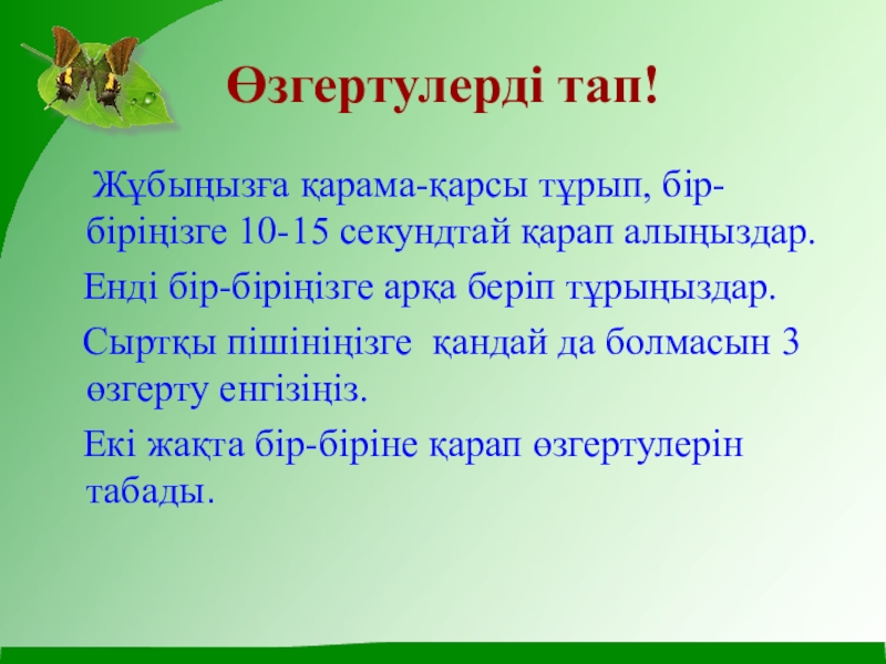 Жұбыңызға қарама-қарсы тұрып, бір-біріңізге 10-15 секундтай қарап алыңыздар.