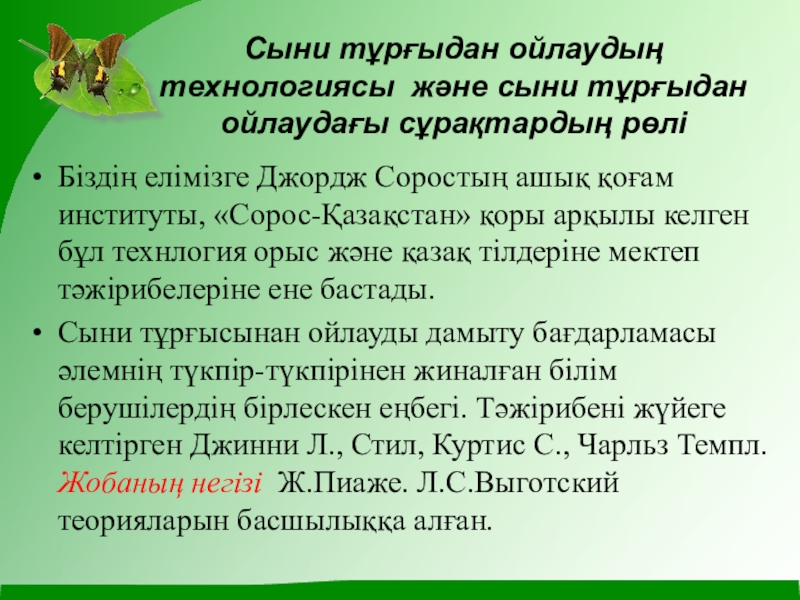 Сыни тұрғысынан ойлауды дамыту бағдарламасы әлемнің түкпір-түкпірінен жиналған білім берушілердің бірлескен еңбегі. Тәжірибені жүйеге келтірген Джинни Л., Стил, Куртис С., Чарльз Темпл. Жобаның негізі Ж.Пиаже. Л.С.Выготский теорияларын басшылыққа алған.