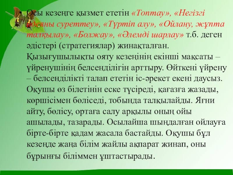 жұпта талқылау», «Болжау», «Әлемді шарлау» т.б. деген әдістері (стратегиялар) жинақталған. Қызығушылықты ояту кезеңінің екінші мақсаты –үйренушінің белсенділігін арттыру. Өйткені үйрену – белсенділікті талап ететін іс-әрекет екені даусыз. Оқушы өз білетінін еске түсіреді, қағазға жазады, көршісімен бөліседі, тобында талқылайды. Яғни айту, бөлісу, ортаға салу арқылы оның ойы ашылады, тазарады. Осылайша шыңдалған ойлауға бірте-бірте қадам жасала бастайды. Оқушы бұл кезеңде жаңа білім жайлы ақпарат жинап, оны бұрынғы біліммен ұштастырады.