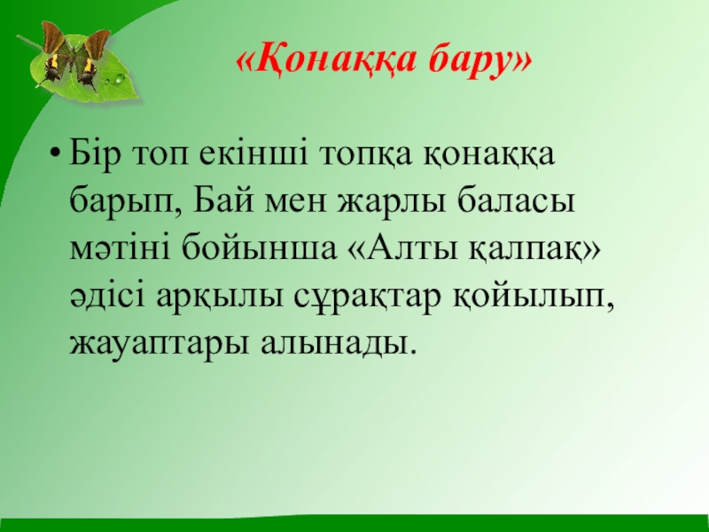 баласы мәтіні бойынша «Алты қалпақ» әдісі арқылы сұрақтар қойылып, жауаптары алынады.