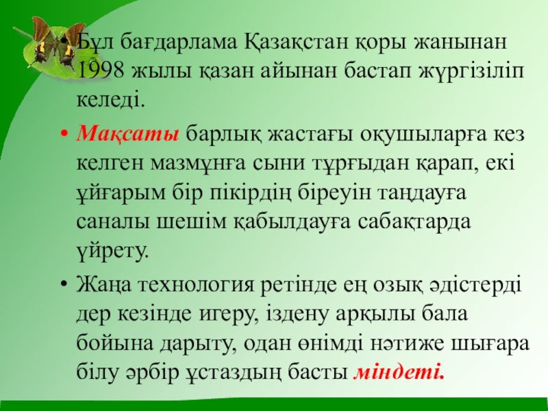 Слайд 2Бұл бағдарлама Қазақстан қоры жанынан 1998 жылы қазан айынан бастап жүргізіліп
