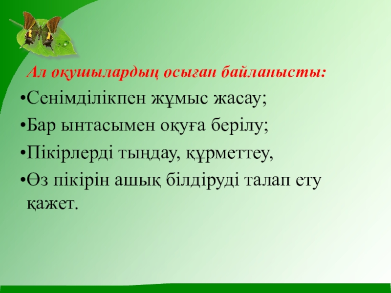 Оқушыларға ойланып-толғануға, ойын ашық айтуға рұқсат беру;