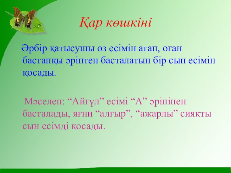 Мәселен: “Айгүл” есімі “А” әріпінен басталады, яғни “алғыр”, “ажарлы” сияқты сын есімді қосады.