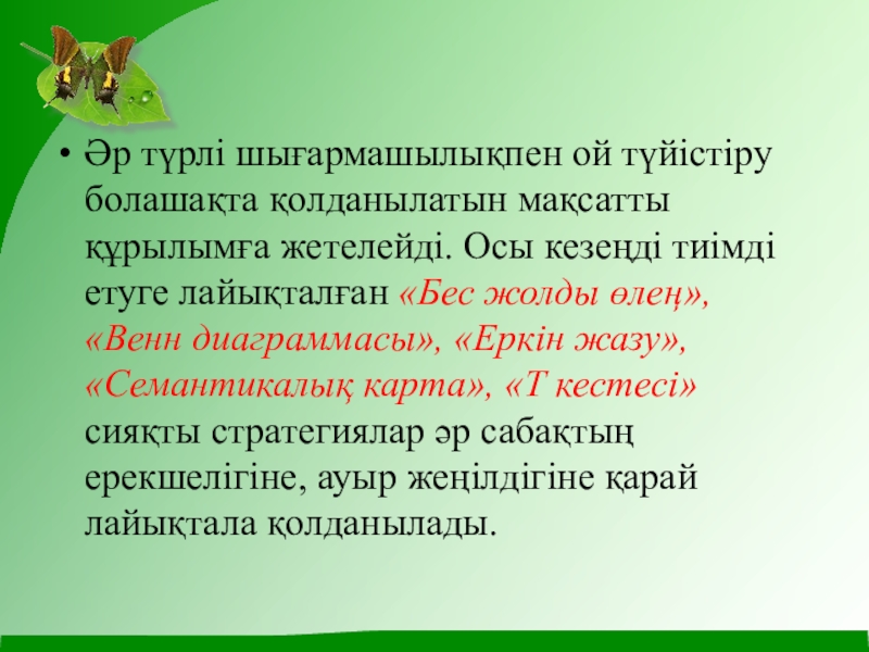 кезеңді тиімді етуге лайықталған «Бес жолды өлең», «Венн диаграммасы», «Еркін жазу», «Семантикалық карта», «Т кестесі» сияқты стратегиялар әр сабақтың ерекшелігіне, ауыр жеңілдігіне қарай лайықтала қолданылады.