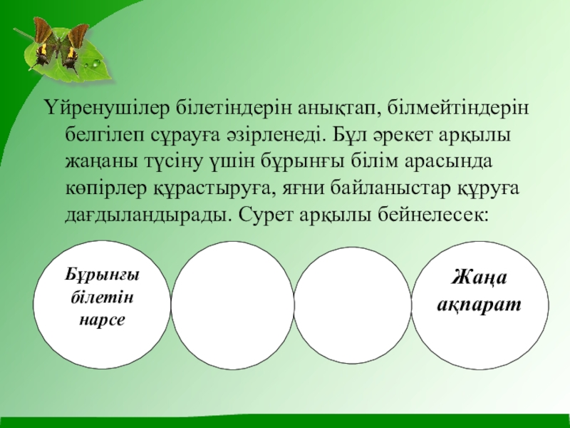 Үйренушілер білетіндерін анықтап, білмейтіндерін белгілеп сұрауға әзірленеді. Бұл әрекет арқылы жаңаны