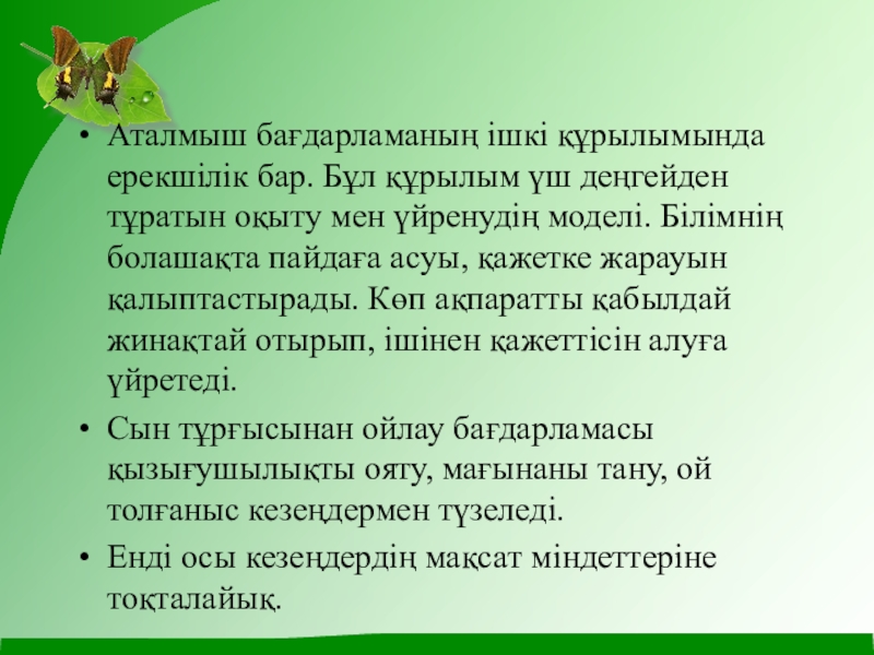 Сын тұрғысынан ойлау бағдарламасы қызығушылықты ояту, мағынаны тану, ой толғаныс кезеңдермен түзеледі.