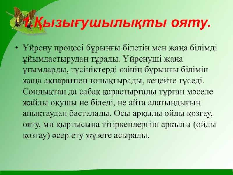 жаңа ұғымдарды, түсініктерді өзінің бұрынғы білімін жаңа ақпаратпен толықтырады, кеңейте түседі. Сондықтан да сабақ қарастырғалы тұрған мәселе жайлы оқушы не біледі, не айта алатындығын анықтаудан басталады. Осы арқылы ойды қозғау, ояту, ми қыртысына тітіркендергіш арқылы (ойды қозғау) әсер ету жүзеге асырады.