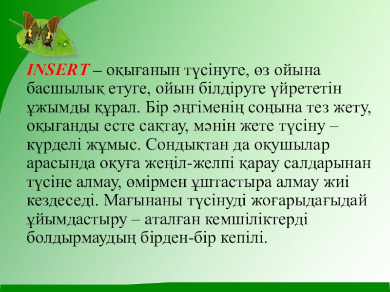 Слайд 9INSERT – оқығанын түсінуге, өз ойына басшылық етуге, ойын білдіруге үйрететін