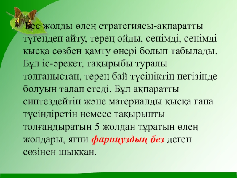 Слайд 13 Бес жолды өлең стратегиясы-ақпаратты түгендеп айту, терең ойды, сенімді,