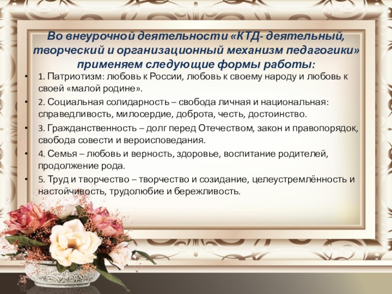 5. Труд и творчество – творчество и созидание, целеустремлённость и настойчивость, трудолюбие и бережливость.