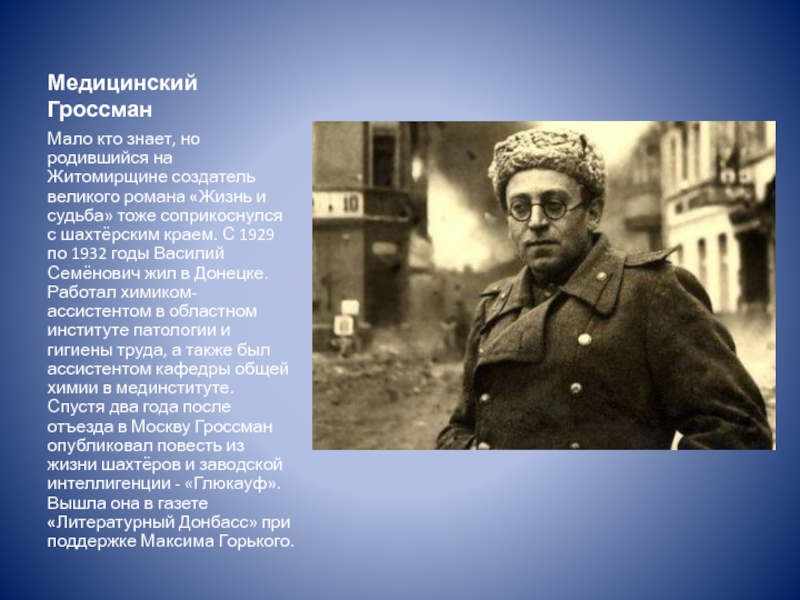 «Жизнь и судьба» тоже соприкоснулся с шахтёрским краем. С 1929 по 1932 годы Василий Семёнович жил в Донецке. Работал химиком-ассистентом в областном институте патологии и гигиены труда, а также был ассистентом кафедры общей химии в мединституте. Спустя два года после отъезда в Москву Гроссман опубликовал повесть из жизни шахтёров и заводской интеллигенции - «Глюкауф». Вышла она в газете «Литературный Донбасс» при поддержке Максима Горького.