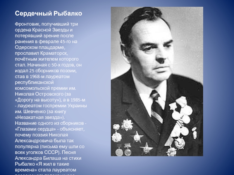 ранения в феврале 45-го на Одерском плацдарме, прославил Краматорск, почётным жителем которого стал. Начиная с 50-х годов, он издал 25 сборников поэзии, став в 1968-м лауреатом республиканской комсомольской премии им. Николая Островского (за «Дорогу на высоту»), а в 1985-м - лауреатом госпремии Украины им. Шевченко (за книгу «Незакатная звезда»). Название одного из сборников - «Глазами сердца» - объясняет, почему поэзия Николая Александровича была так популярна (письма ему шли со всех уголков СССР). Песня Александра Билаша на стихи Рыбалко «Я жил в такие времена» стала лауреатом всесоюзного телеконкурса «Песня-75».